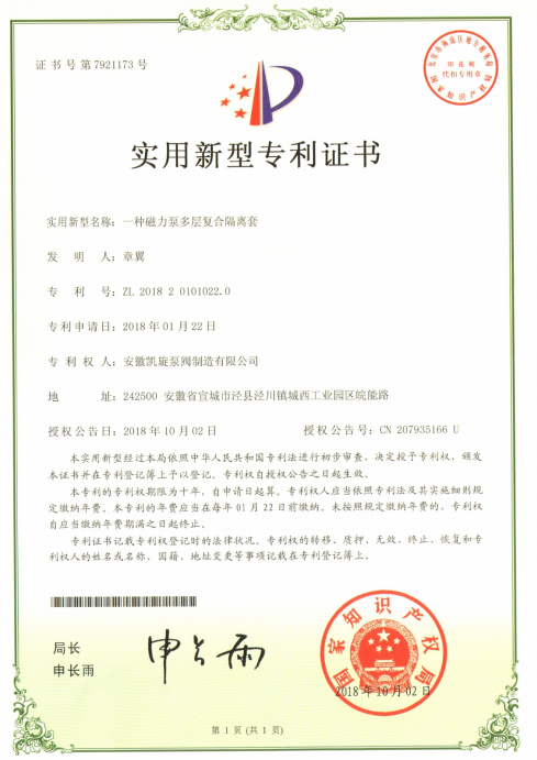 專利證書:一種磁力泵多層復(fù)合隔離套