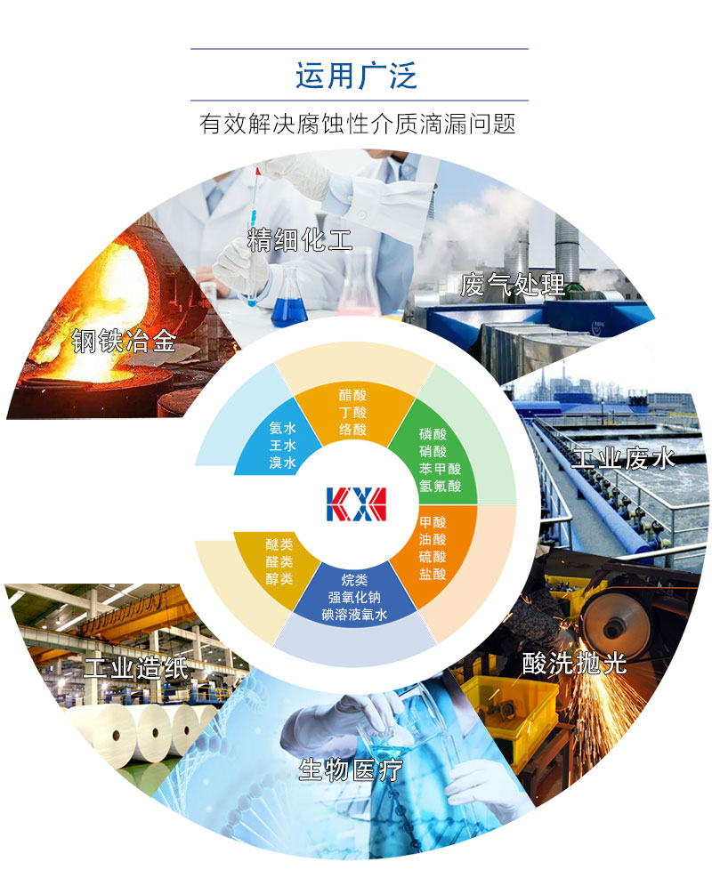應(yīng)用領(lǐng)域:汽車制造中的酸洗、噴漆工藝、有色金屬冶煉中電解液輸送、燒堿項(xiàng)目中的氯水、廢水處理和加酸等工藝流程